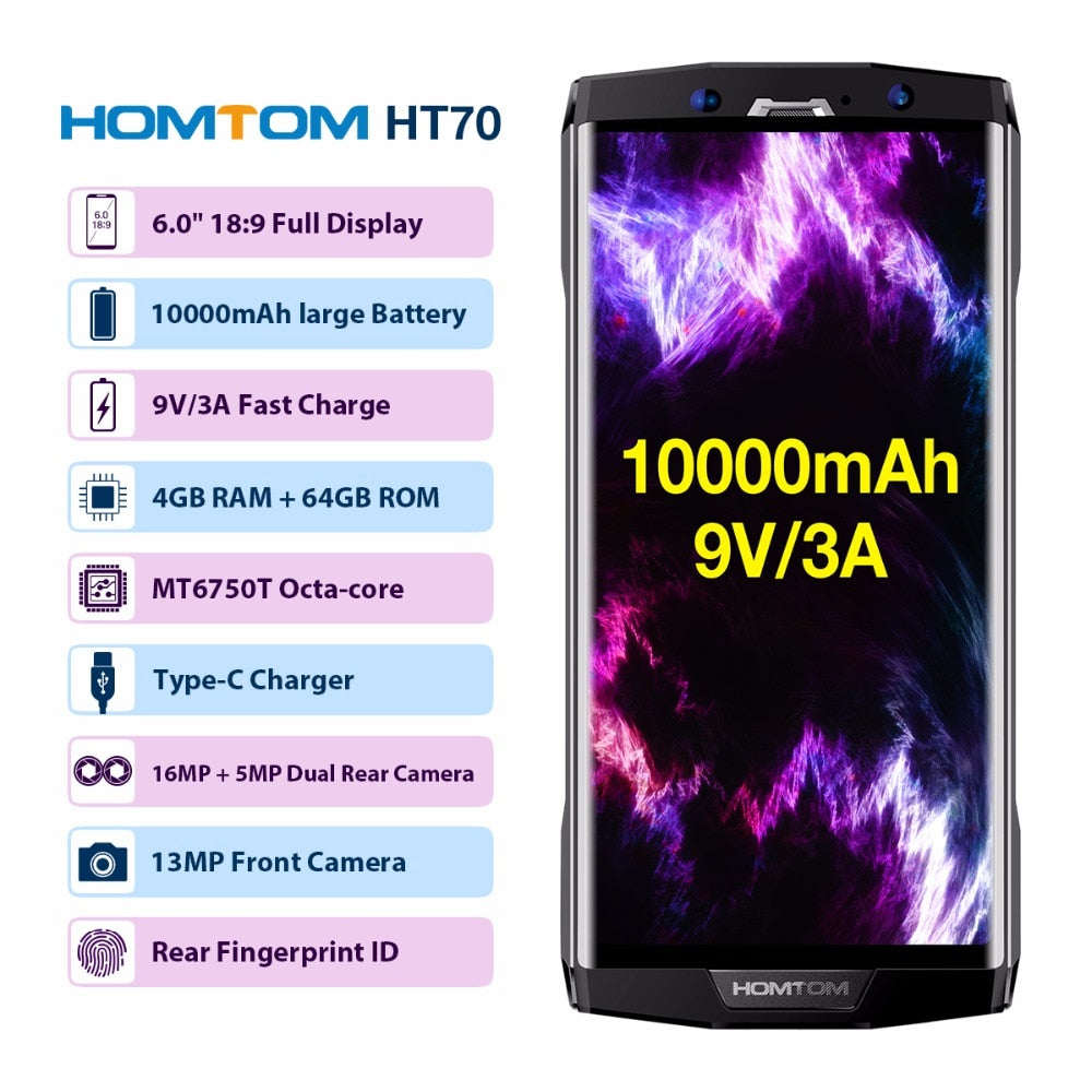 HOMTOM HT70 6.0" HD+ 18:9 Screen Mobile Phone MTK6750T Octa Core 4G RAM 64G ROM 10000mAh Battery 16MP+5MP Dual Cam 4G Smartphone