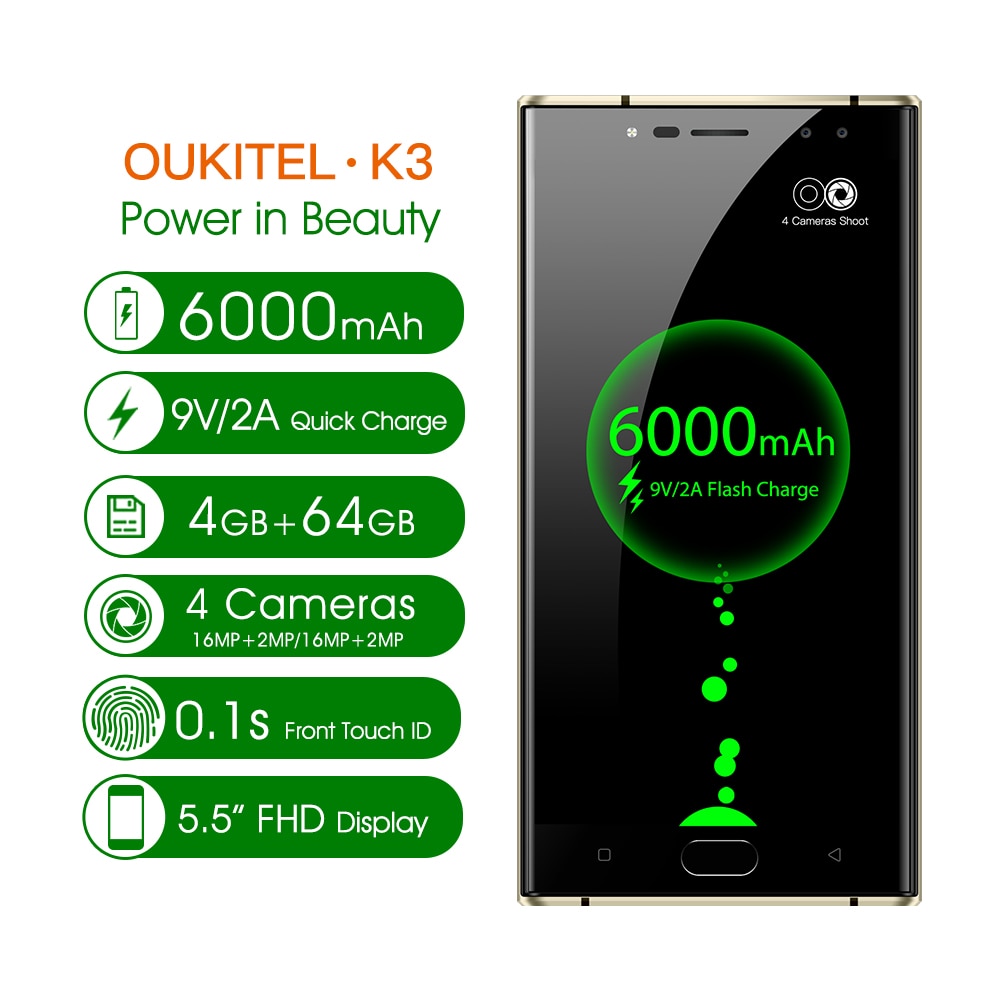 Original OUKITEL K3 Four Cams 6080mAh 9V/2A 4G Mobile Phone 5.5'' FHD Android 7.0 Octa Core 4GB+64GB MTK6750T 13MP Smartphone